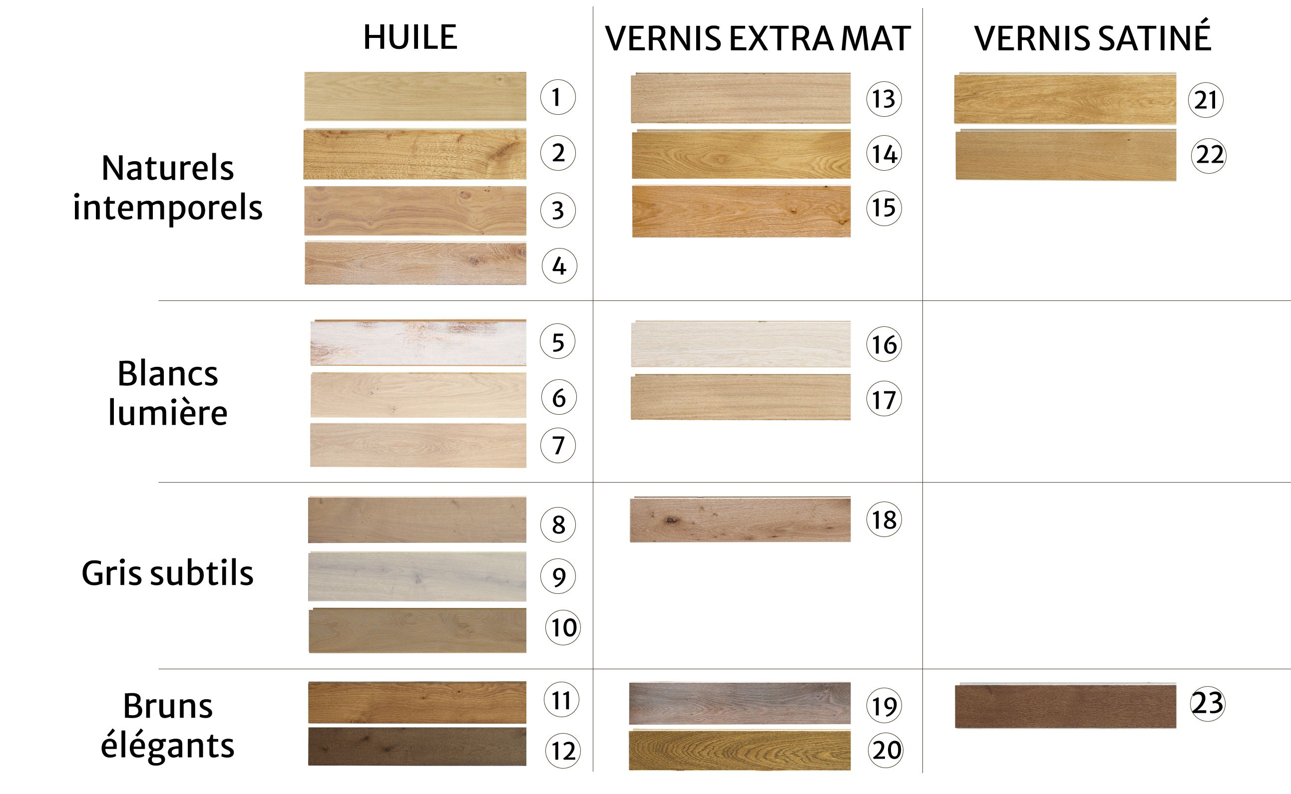 1 : Huile bois naturel - Brossé huilé aspect boit brut 2 : Huile naturelle - Brossé huilé nature 3 : Amande - Brossé huilé naturel légèrement cérusé 4 : Sable - Brossé huilé naturel patiné blanchi 5 : Shabi chaux - Brossé aspect usé huilé blanc 6 : Huile blanche - Brossé huilé blanc 7 : Tufeau - Brossé huilé ton craie 8 : Rafia - Brossé huilé ton raphia naturel 9 : Huile grise - Brossé huilé gris 10 : Flanelle - Brossé huilé ton gris brun 11 : Cuir - Brossé huilé aspect vieux cuir 12 : Tourbe - Brossé huilé ton brun/noir proche de la tourbe | 13 : Bois flotté - brossé vernis mat aspect bois brut 14 : Topaze - Brossé vernis mat 15 : Miel - Brossé vernis mat naturel 16 : Saphir - Brossé vernis mat blanchi 17 : Linen - Brossé vernis mat avec voile de blanc 18 : Café crème - Brossé vernis mat couleur café au lait 19 : Argile - Brossé mat couleur terre 20 : Habano - Brossé vernis mat ton havane | 21 : Satiné - Non brossé vernis satiné 22 : Opale - Brossé vernis satiné 23 : Fauve - Brossé vernis satiné brun |